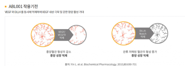 ABL001은 안티-VEGF와 안티-DLL4를 타깃하는 이중항체 항암제로, 기존 단일항체 대비 강력한 항종양 효과와 내성 극복 가능성을 가진다.